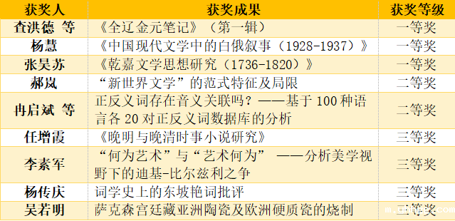 查洪德教授等的古籍整理成果《全辽金元笔记》(第一辑)、杨慧教授的专著《中国现代文学中的白俄叙事(1928-1937)》和张昊苏副教授的专著《乾嘉文学思想研究(1736-1820)》获得著作类一等奖;郝岚教授的“‘新世界文学’的范式特征及局限”和冉启斌教授等的“正反义词存在音义关联吗?——基于100种语言各20对正反义词数据库的分析”获得论文类二等奖;任增霞副教授的专著《晚明与晚清时事小说研究》获得著作类三等奖;李素军副教授的“‘何为艺术’与‘艺术何为’——分析美学视野下的迪基-比尔兹利之争”、杨传庆副教授的“词学史上的东坡艳词批评”和吴若明副教授的“萨克森宫廷藏亚洲陶瓷及欧洲硬质瓷的烧制”获得论文类三等奖。