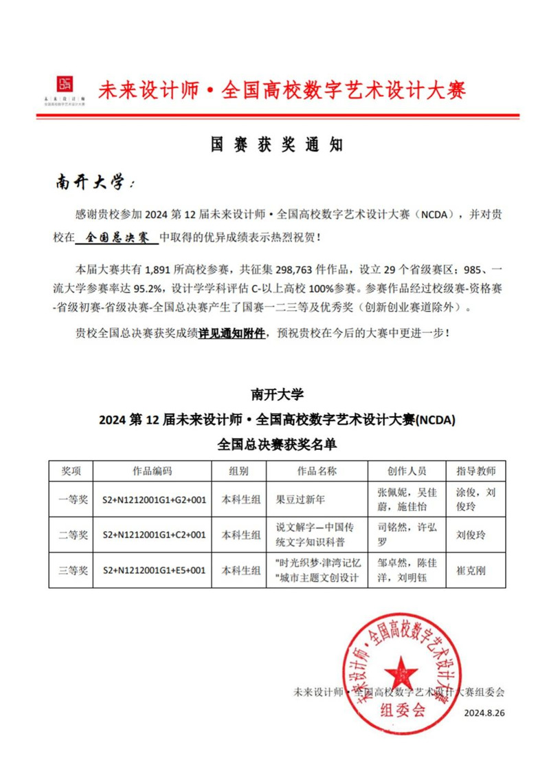 近日,第十二届未来设计师·全国高校数字艺术设计大赛(NCDA)天津赛区及全国总决赛获奖名单正式公布。我院学生在全国总决赛获一等奖1项、二等奖1项、三等奖1项,在天津赛区获得一等奖2项、二等奖5项、三等奖3项。大赛授予米兰官方网站是什么优秀组织奖,涂俊、刘俊玲老师获荣获优秀指导教师。